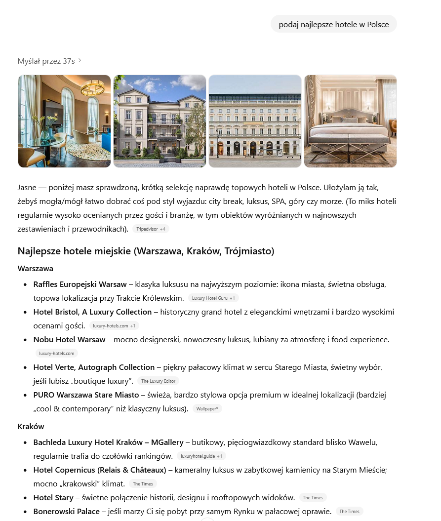 Poniżej grafika – odpowiedź ChatGPT z przygotowaną listą najlepszych hoteli w Polsce.